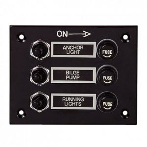 Tableau étanche en aluminium noir avec interrupteurs à voyant LED.