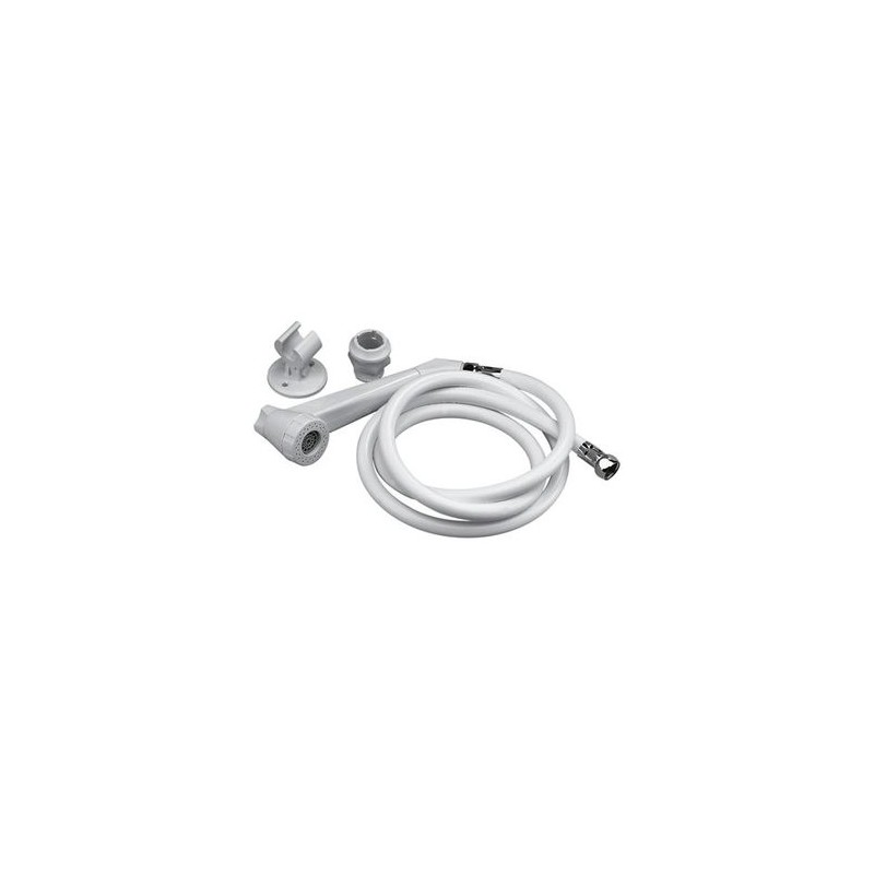 Kit douche.Comprend :- Une pomme de douche blanche à jet directionnel.- Un tuyau de 1.50m- Un support mural.Presssion : 2 bar.